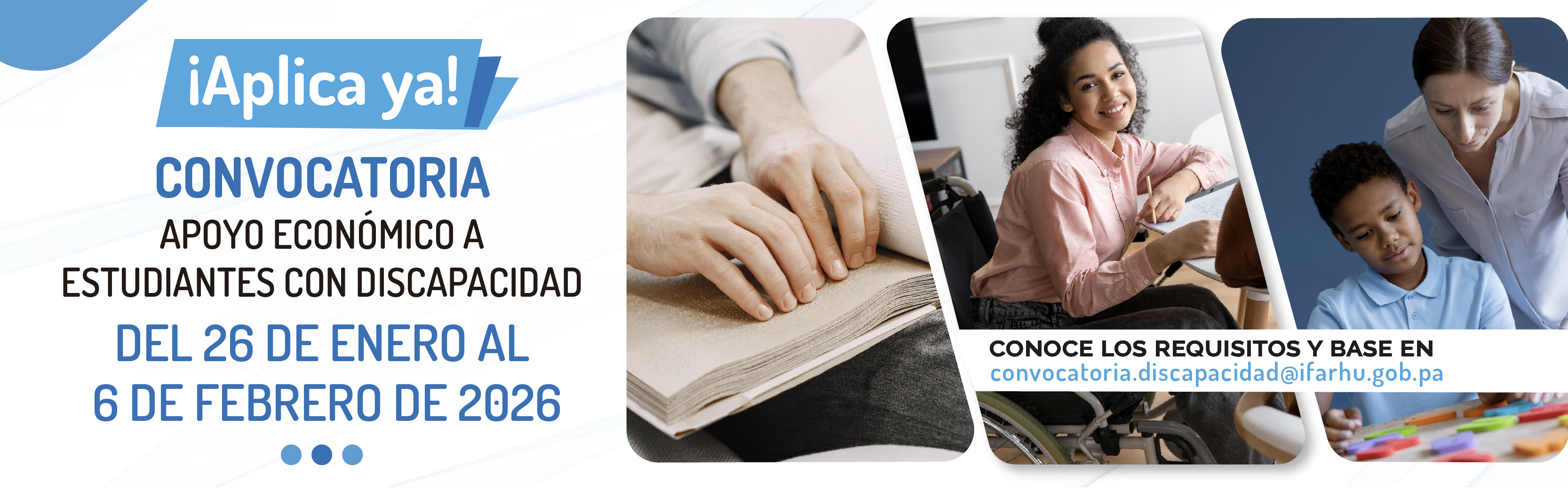 Con el objetivo de impulsar la inclusión y garantizar el acceso a la educación, el Instituto para la Formación y Aprovechamiento de Recursos Humanos (IFARHU) abrirá la convocatoria 2026 del Programa de Apoyo Económico para Estudiantes con Discapacidad, con un período de inscripción que se extenderá del 26 de enero al 6 de febrero de 2026.